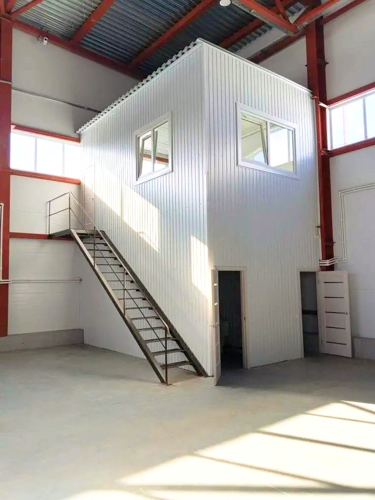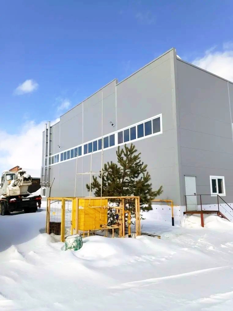 Изготовлен из-за металлоконструкций, стены сэндвич панели, кровля мягкая ПВХ мембрана.