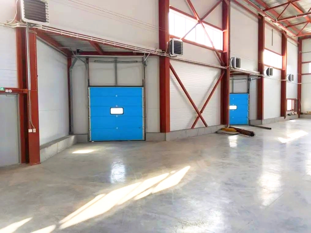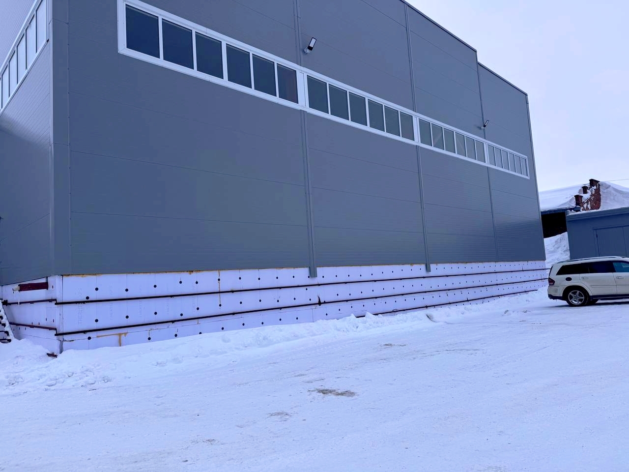 Разделено на два помещения 1100м2 и 1300м2. общая площадь 2 410 М 2, высота потолков 6 м, Ширина 30 м, длина 80 м.